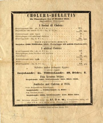 Kolera-bulletin för Stockholm, den 25 september 1853 ; Cholera-bulletin för Thorsdagen den 13 Oktober 1853 (Sextiondeförsta Choleradygnet.)